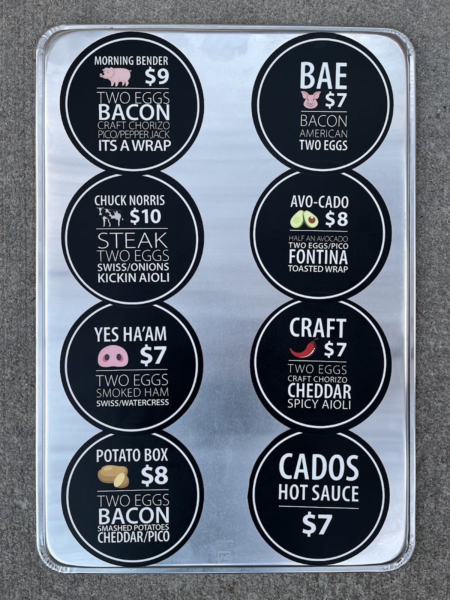 Cados Egg Truck offers a unique, egg-centric menu that combines simple ingredients with bold flavors. Highlights include the Egg Sandwich, featuring a perfectly fried egg topped with crispy bacon and melty cheese, all tucked inside a fresh, soft bun. Another standout is the Breakfast Burrito, packed with scrambled eggs, avocado, and seasoned potatoes, creating a satisfying and flavorful start to the day. For a lighter option, the Egg Salad serves as a refreshing choice, with creamy dressing and a mix of garden-fresh greens. If you're in the mood for something sweet, the French Toast drizzled with syrup and dusted with powdered sugar offers a decadent treat. Each dish emphasizes the richness of eggs, making it clear that the star of the show is the humble egg, prepared in creative and tasty ways. Whether you're stopping by for a quick breakfast or a leisurely brunch, Cados Egg Truck delivers satisfying comfort food with a focus on quality ingredients.
